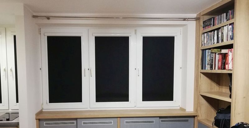 Tkanina rolety w systemie Classic pracuje blisko szyby, a prowadnice boczne przytrzymują tkaninę podczas uchylania skrzydła.