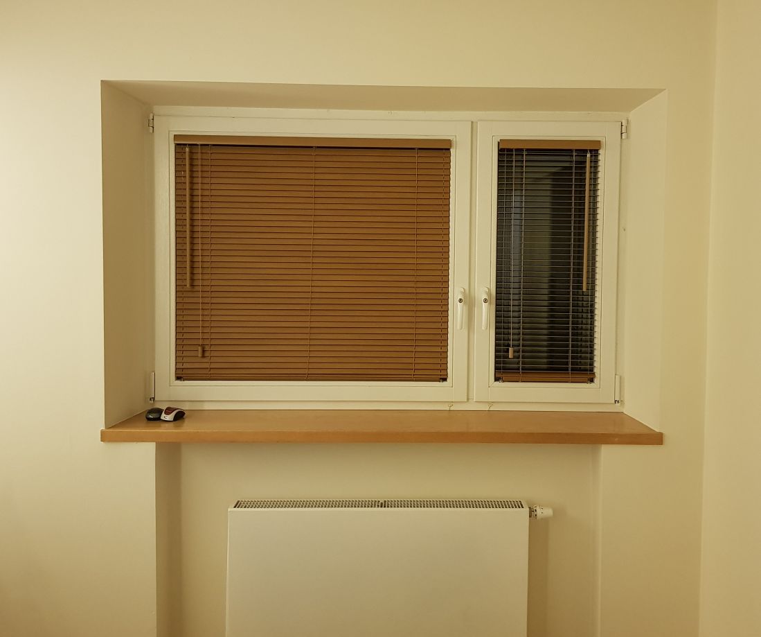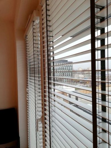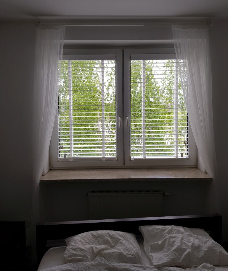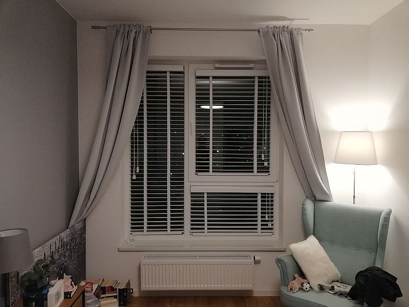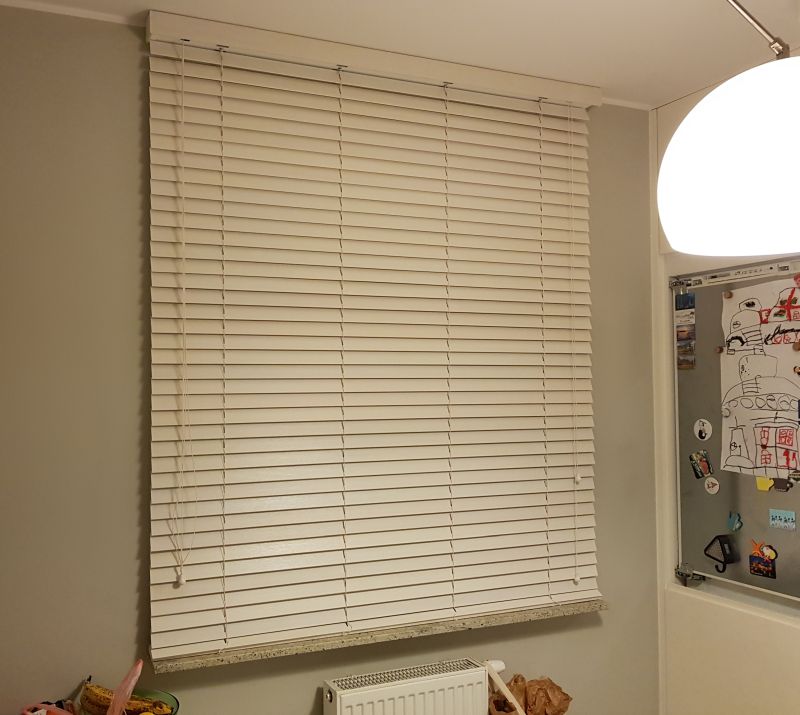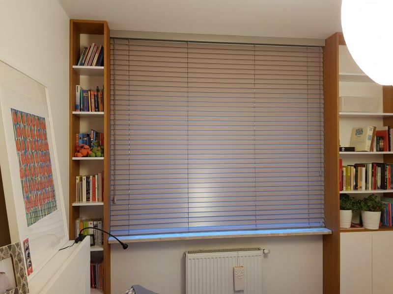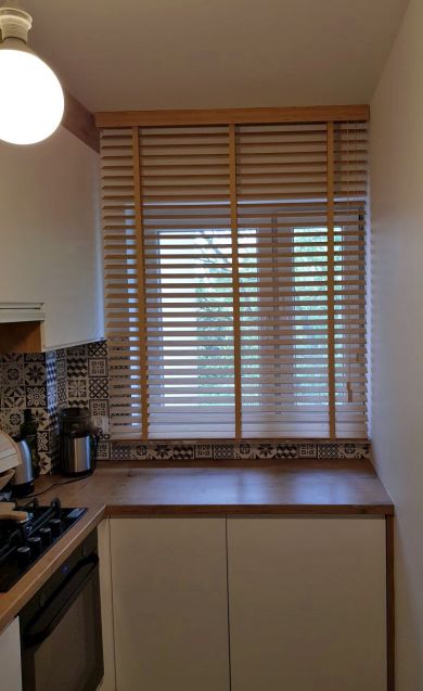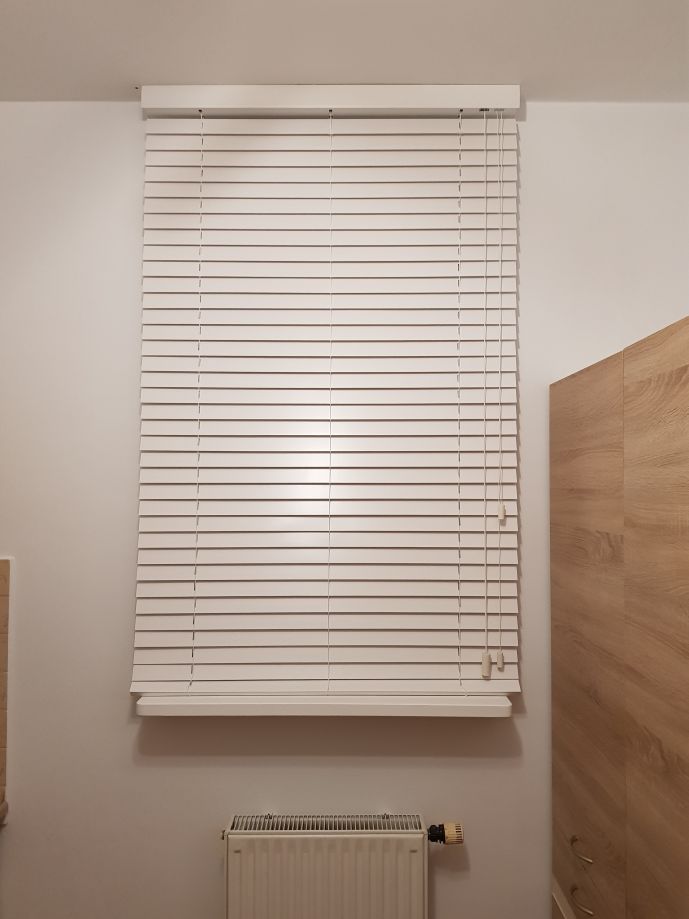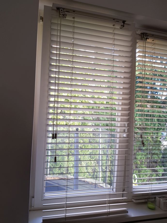 Lamele żaluzji drewnianej 25mm po podciągnięciu zajmują ok. 20% całkowitej swojej wysokości, a żaluzje 50mm ok.15%.