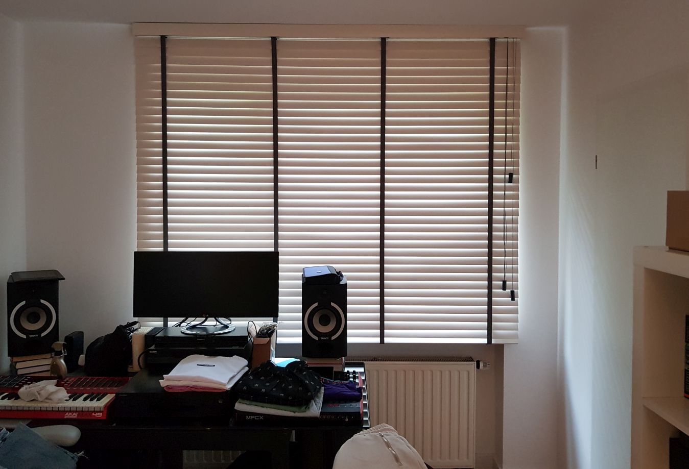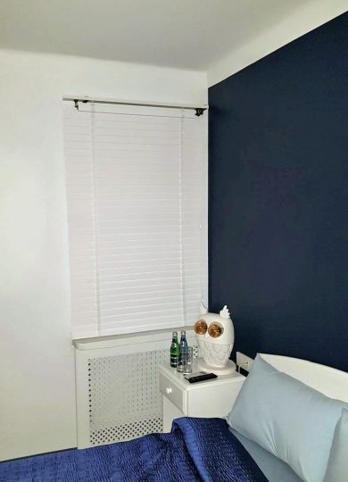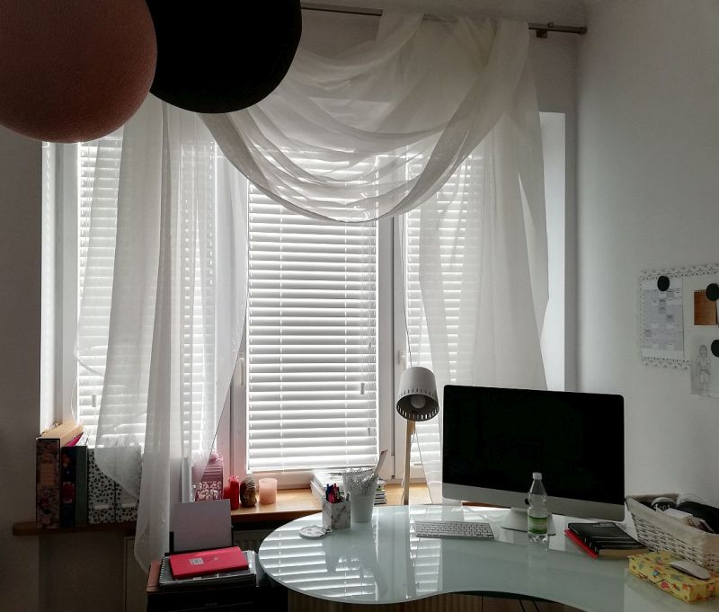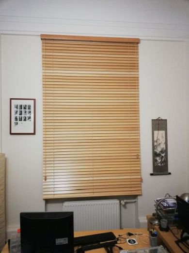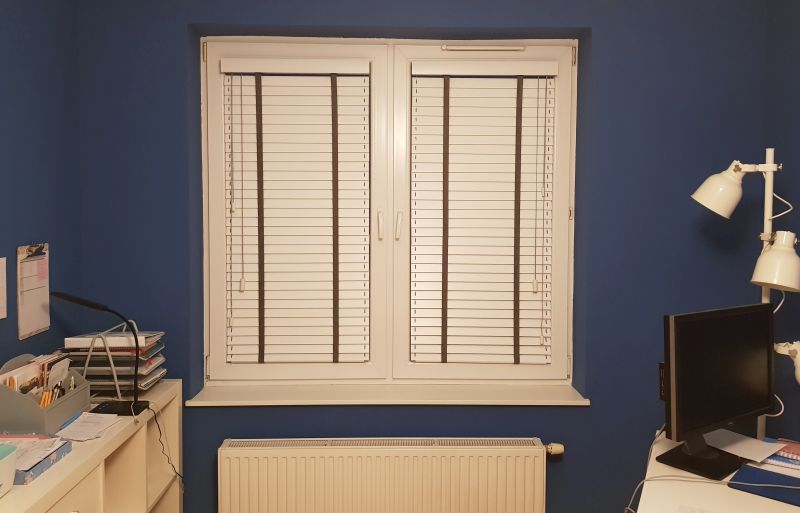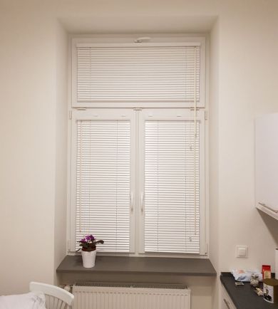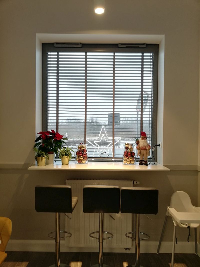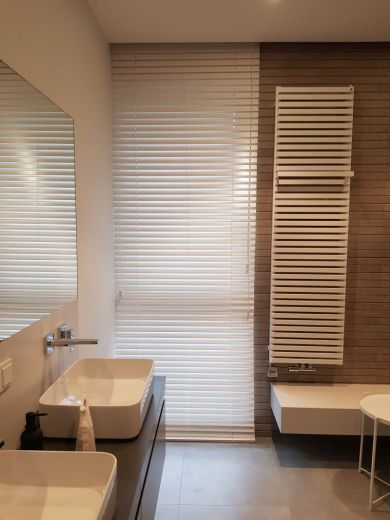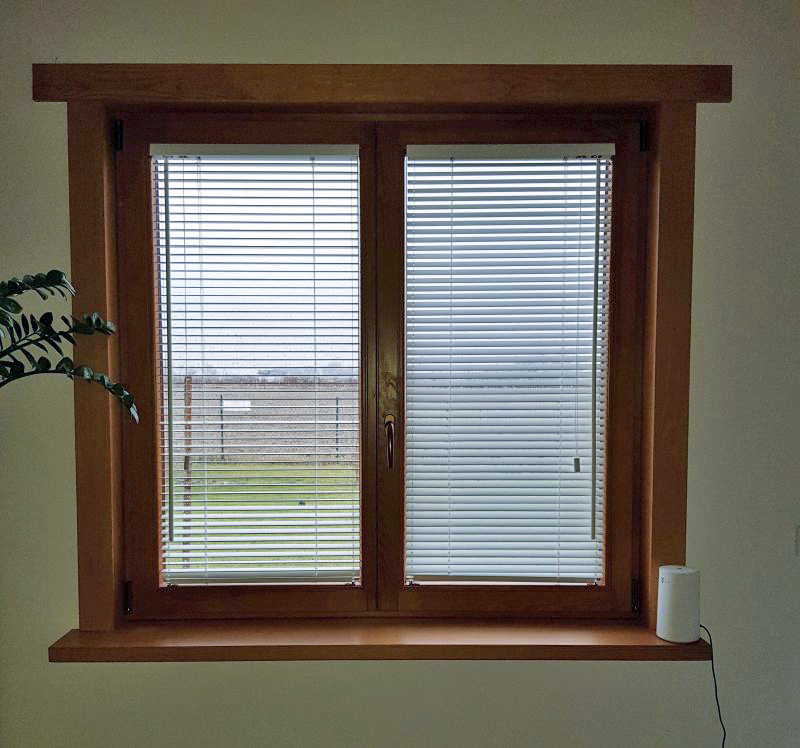 Lamele żaluzji drewnianej 25mm po podciągnięciu zajmują ok. 20% całkowitej swojej wysokości, a żaluzje 50mm ok.15%.